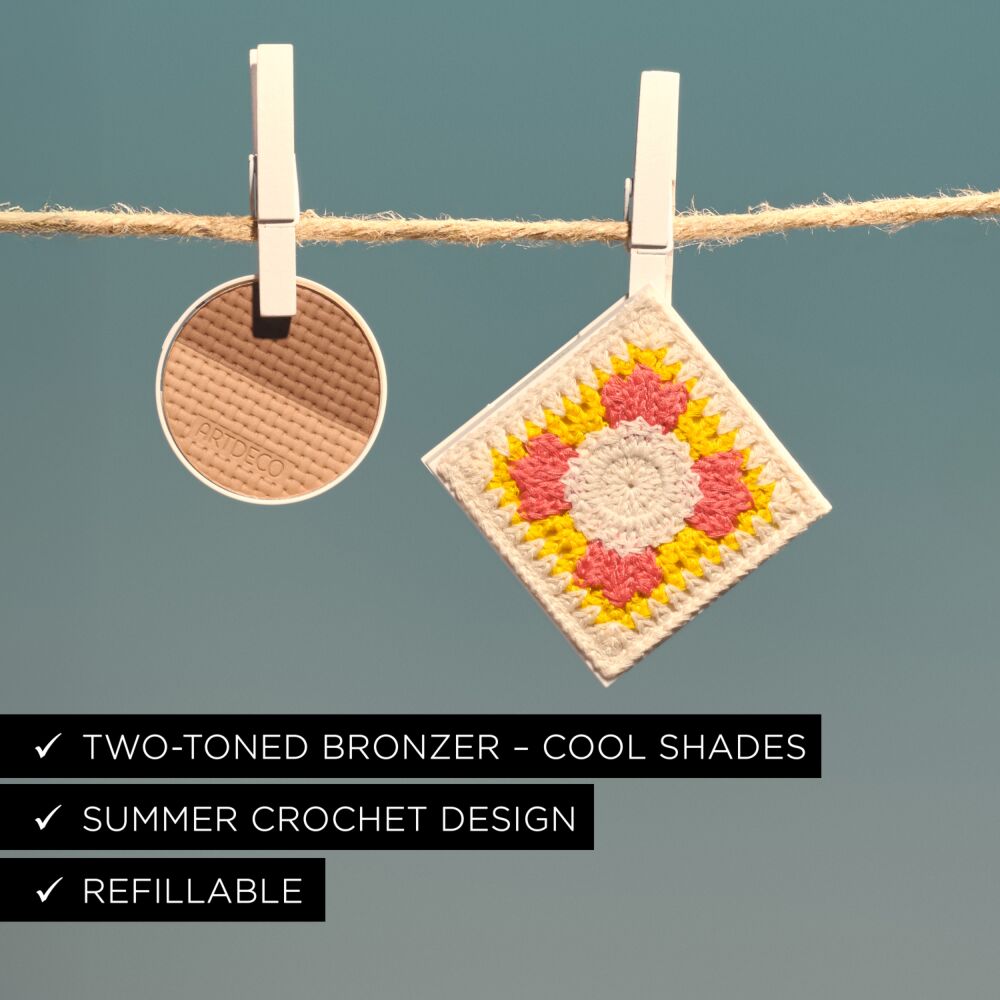 Barva in tekstura: Dva hladna odtenka sta popolno usklajena – zmešaj ju s čopičem za puder za idealen ten ali ju uporabi posamično za bolj oseben videz. Nežen perlasti sijaj doda ličnicam prefinjen zaključek. Žametno mehka tekstura zagotavlja prijeten občutek na koži, takojšnja sprostitev barve pa poskrbi za enostaven nanos. Unikaten kvačkan dizajn iz prave preje pa je prava paša za oči – bronzer, ki preprosto kliče po poletju!