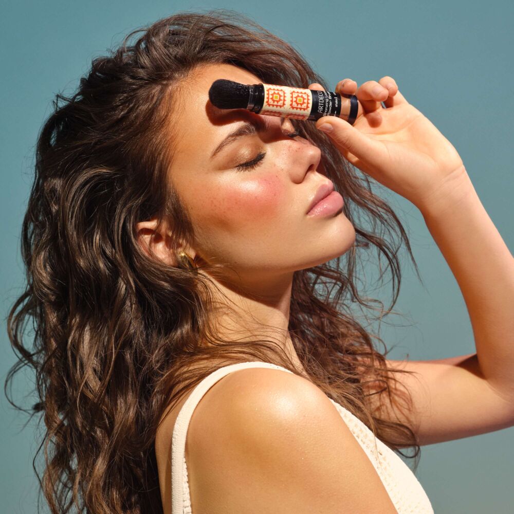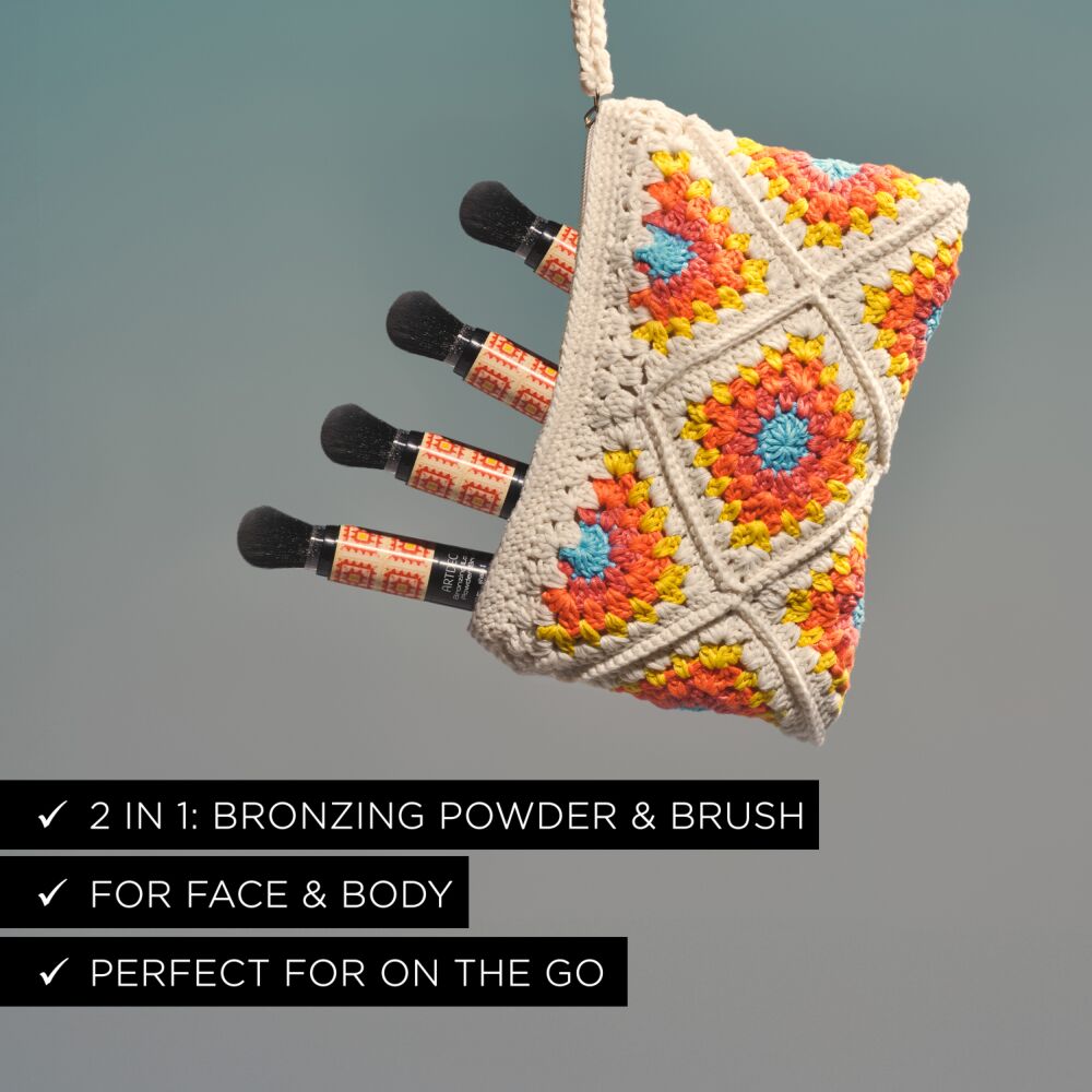 Bronzing Loose Powder Brush za obraz in telo ti v hipu podari naravno zagorel videz. Žametna tekstura s subtilnim perlastim sijajem, nežno odbija svetlobo in tvoji koži doda tisti čudovit, sončen ten. Puder se zlahka nanaša in zabriše, integrirani čopič pa poskrbi, da si vedno pripravljena na osvežitev videza – kjerkoli si!